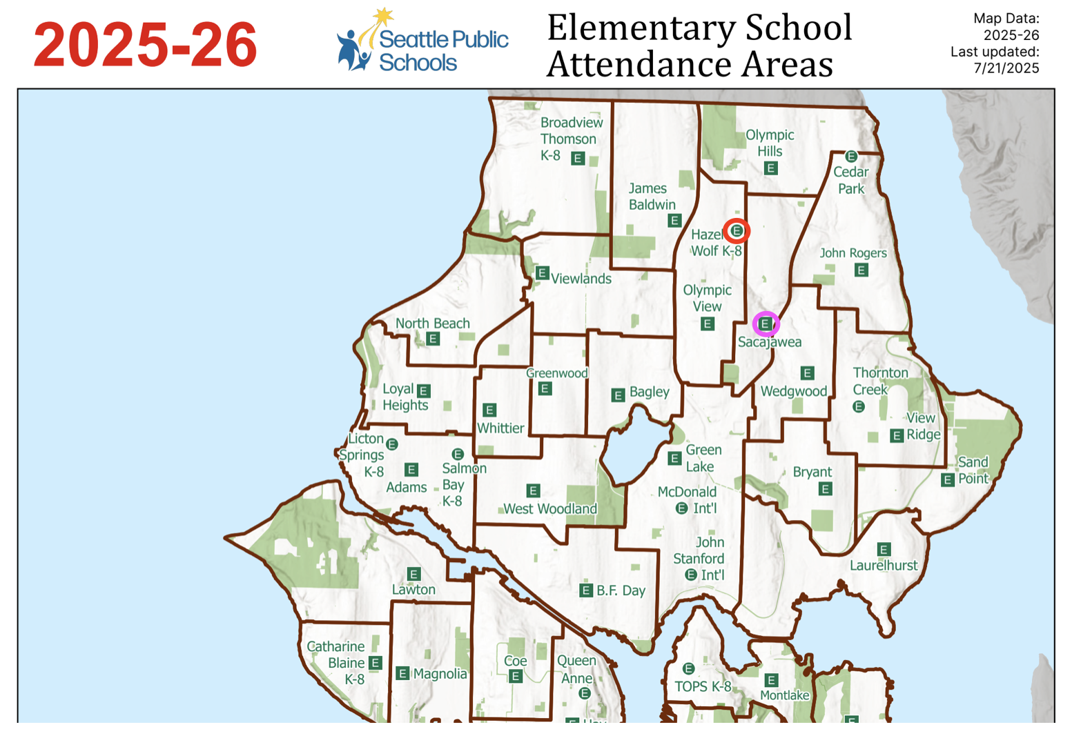 SPS attendance area map for 2025-26 (circle annotations mine). note how most of the area of sacajawea’s attendance zone is actually closer to hazel wolf k-8.