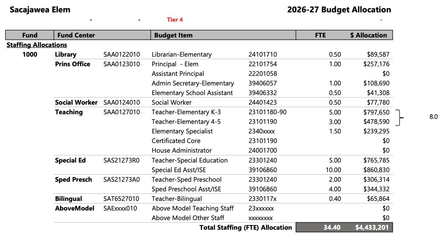 Sacajawea’s 2026-27 staff allocations, from the purple book.