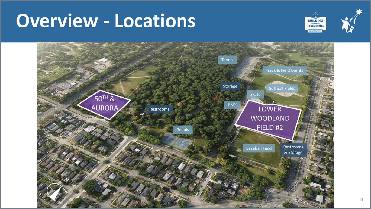 Lower Woodland Park, with purple boxes showing the two locations where football and/or soccer fields would be built under the three proposals being considered. This is an SPS slide from the April 25 community meeting.